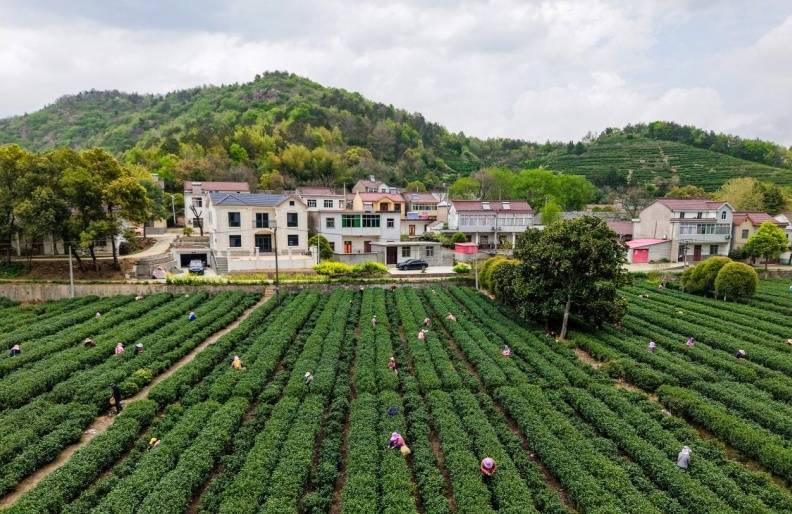 2026年4月4日,安徽省合肥市庐江县柯坦镇,村民抓紧晴好天气采摘明前茶,春茶与村庄相映成趣,构成一幅春日画卷。
